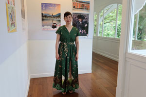 Ms Asuka Hishiki wearing a one-of-a-kind dress featuring a corpse flower print based on her own painting