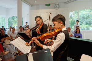 Audiences were treated to an enchanting musical evening featuring the renowned conductor and cellist Mr Yamamoto Yunosuke and pianist Ms Koyama Kyoko, who came specially from Japan for the occasion. They performed alongside Singaporean violinist Mr Gabriel Lee and two young Singaporean musicians, Ms Alyssa Tan and Mr Aaron Tan, who were selected during the open rehearsal. The event showcased a diverse range of music, from classical pieces such as Salut d’Amour, Op. 12 and The Swan from Carnival of the Animals, to modern works including the beloved anime song Carrying You from Castle in the Sky and the iconic Singapore National Day song, Home.