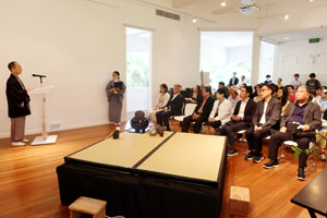The opening ceremony of “The Way of Tea - Chanoyu "茶の湯" - Centuries of Tradition and Japanese Wabi ~ with special exhibition in honour of the late Daisosho ~” was held at JCC on 9 September 2025. The ceremony began with speeches by JCC Director Ms Kawabe Akiko, and President of Chado Urasenke Tankokai Singapore Association Mr Tan Jong Lek. This was followed by a lecture by Mr Kanazawa Sotatsu, Konnichian Deputy Tea Master, who shared about the philosophy and essence of Chanoyu, including the preparation of tea and customary rituals, as well as the late Dr Sen Genshitsu, the 15th Grand Master of Urasenke, and his significant engagements with Singapore.