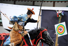 In the yabusame ceremony, archers on horseback shoot at three wooden targets about 68 centimeters (26 inches) square and 1 centimeter (3/8 inch) thick while speeding along at full gallop. The targets are placed up to about 80 meters...(Click here to read more)